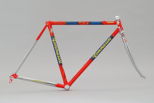 身長165cm(典型的日本人体系)のお客様です。どんなに頑張ってもフレームサイズは490mmが限界、 しかし、ヘッドチューブは哀しい程短くなり せっかくのメッキラグがさえません。 思い切って 少しスローピングに(480mm) そして、 ヘッドチューブはフレームサイズ540mm程度のフレーム並みに長く取りました。 トマッシーニなら こんなサイズオーダーも可能です。
